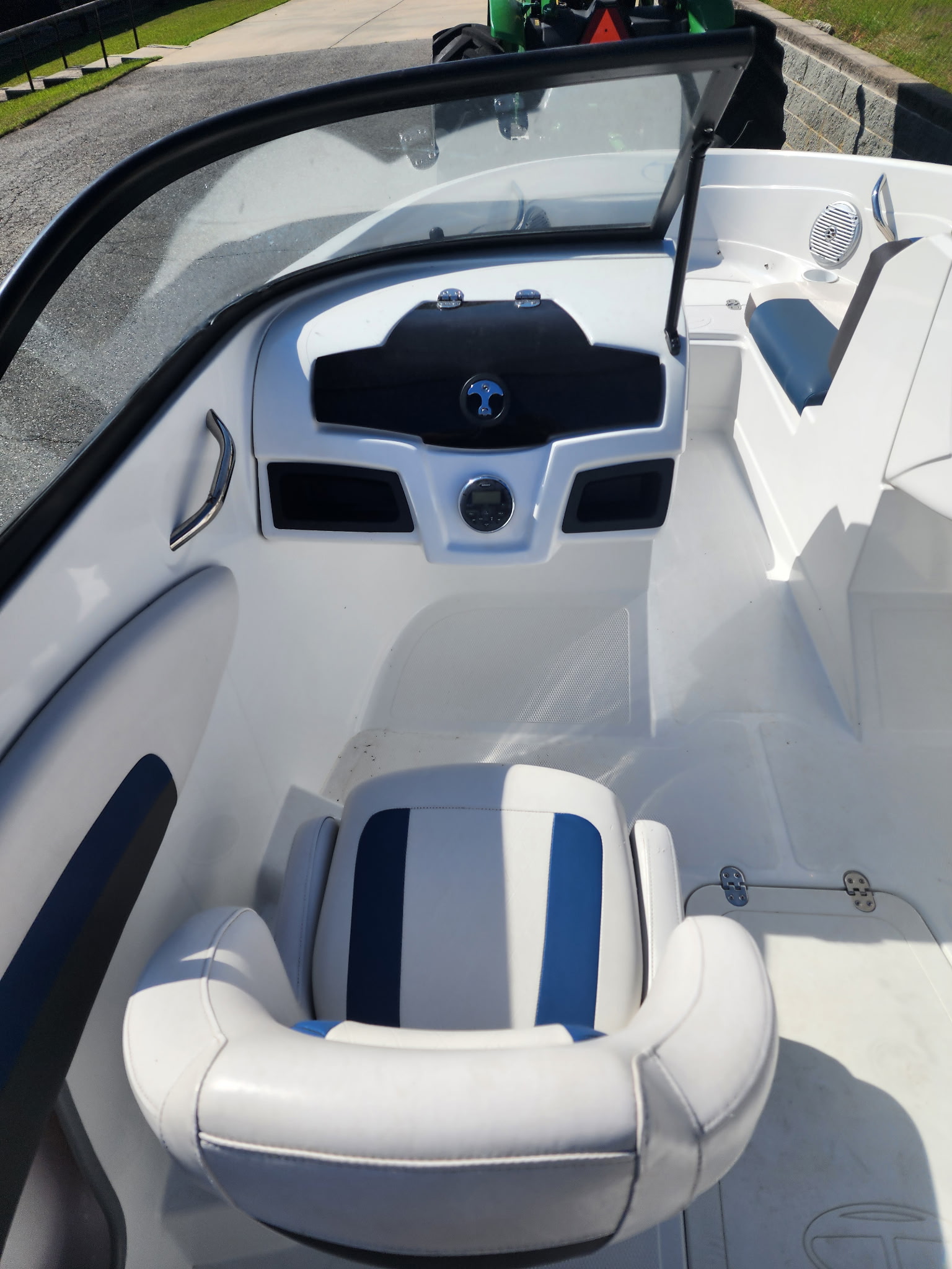 - Port & starboard consoles w/walk-thru windshield & port storage