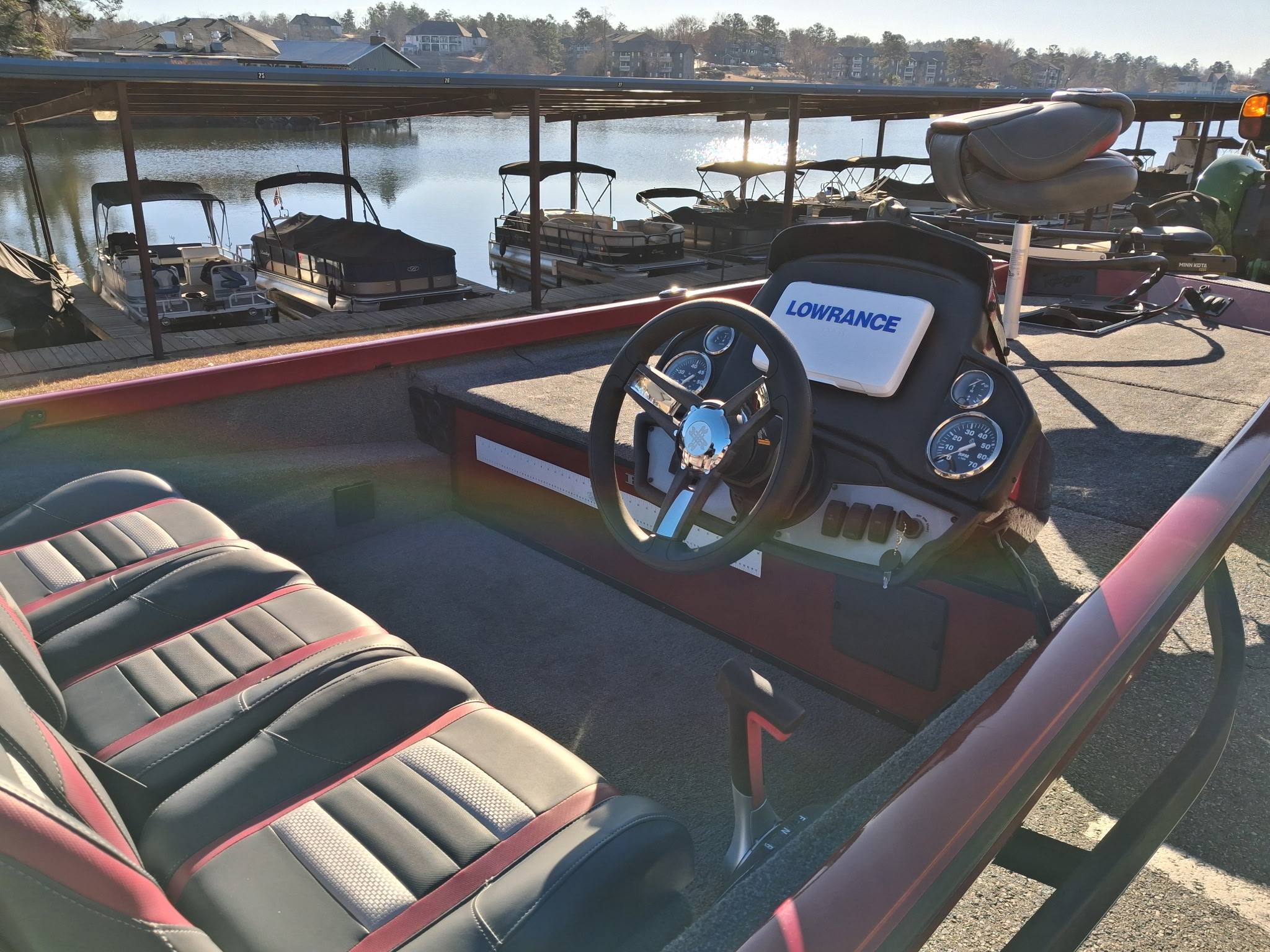 Custom fiberglass console w/ flush-mounted depthfinder, tach, speed, fuel, trim gauge & easy touch switching