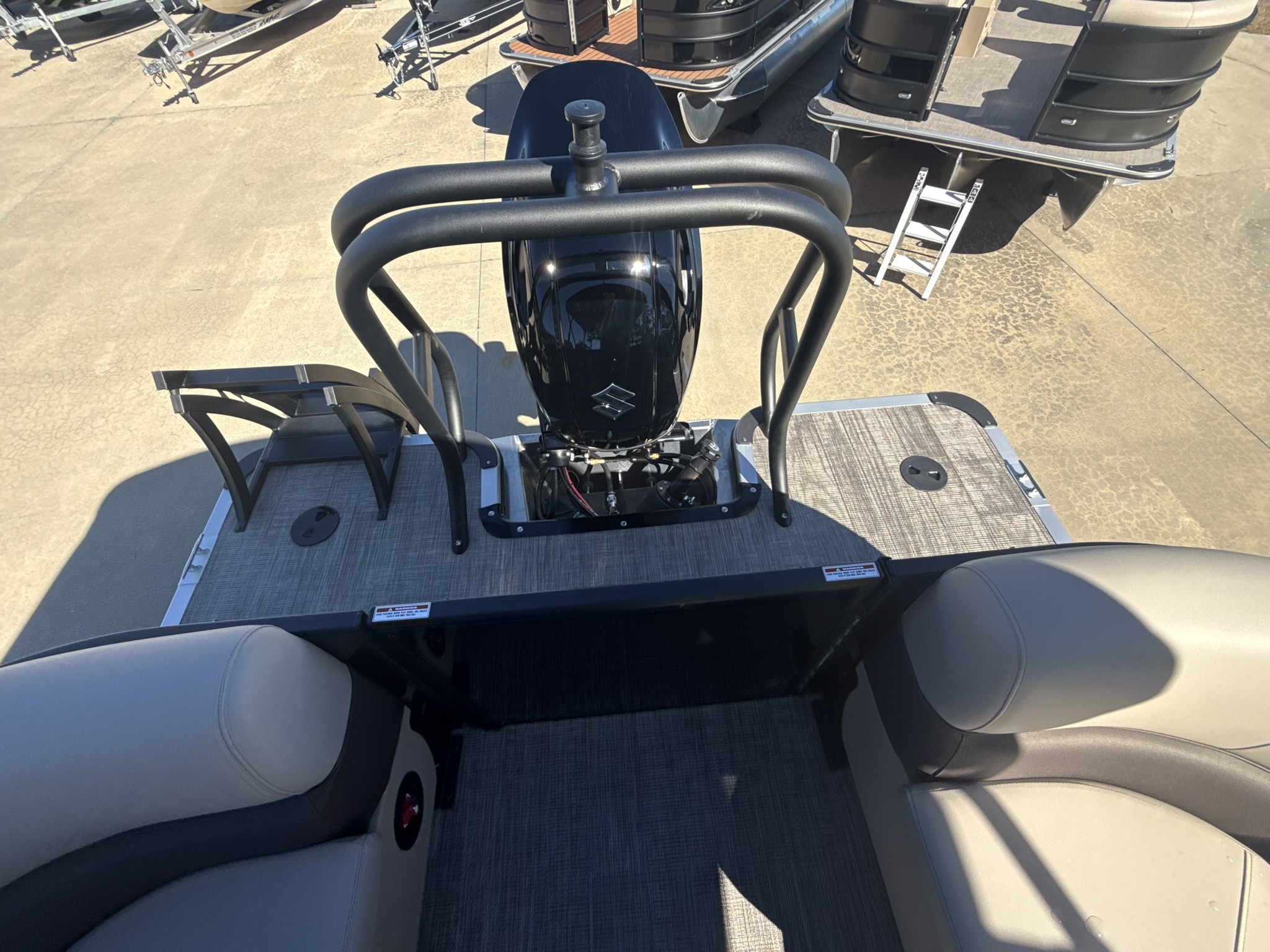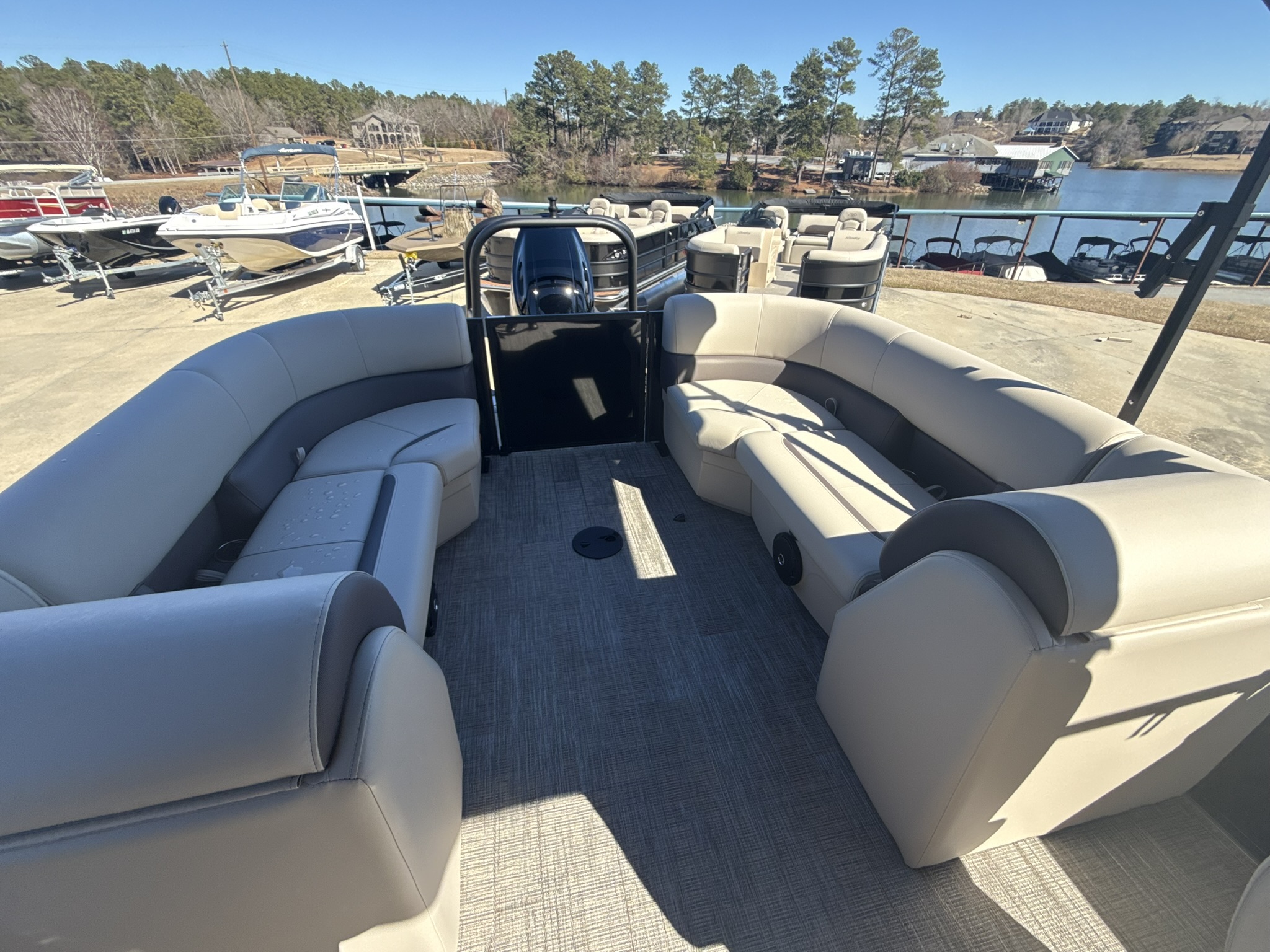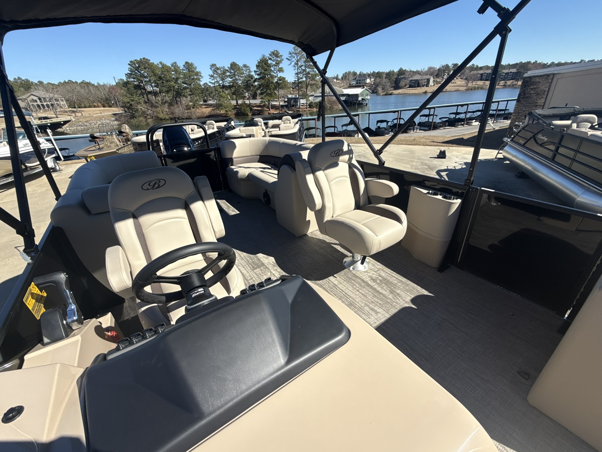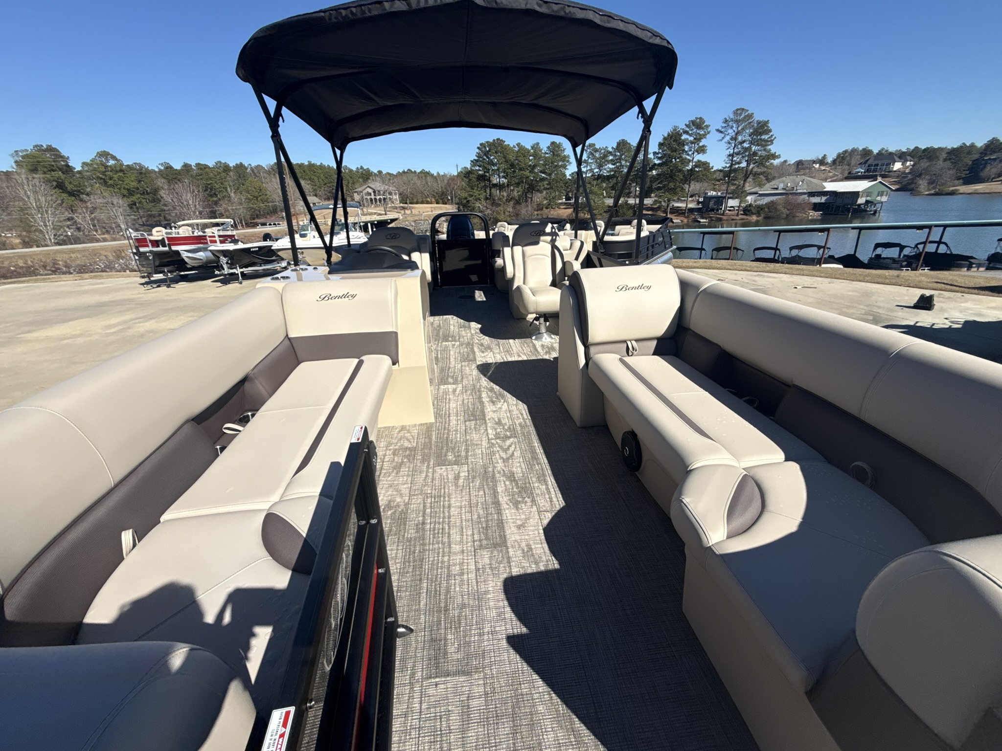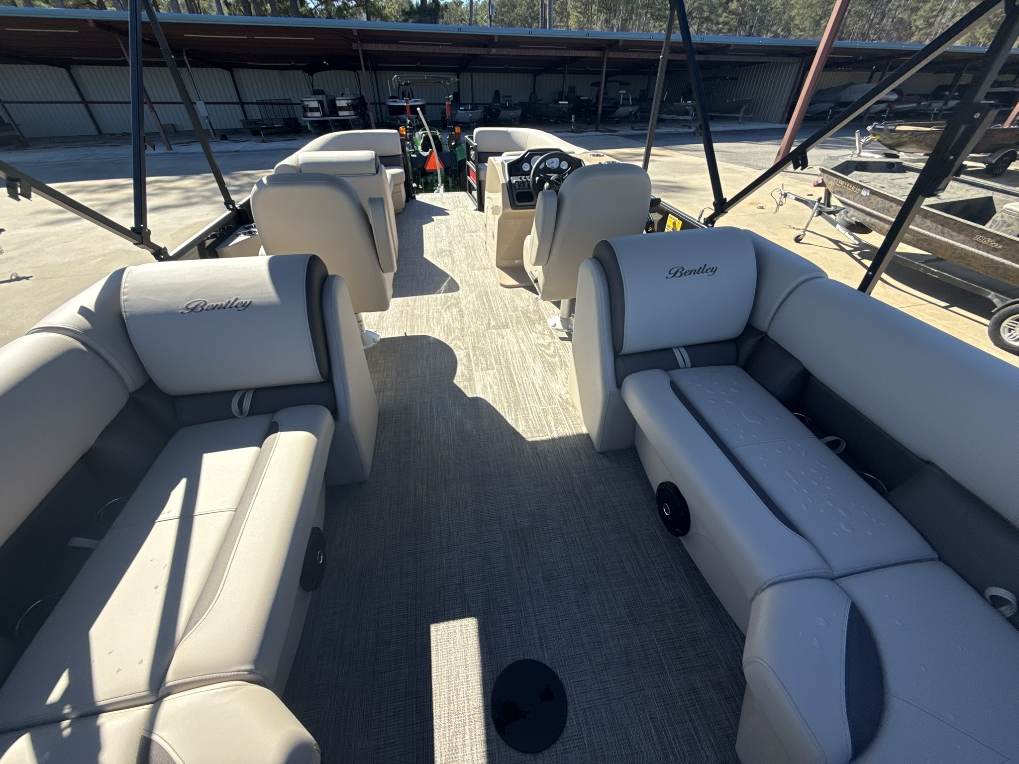Enjoy smooth cruising and plenty of space with this Bentley Navigator 243 Tritoon, powered by a 200 HP Suzuki outboard motor. With its tan interior, tan Lakeport plank flooring, and black anodized frame, this pontoon is built for both comfort and style on the water.