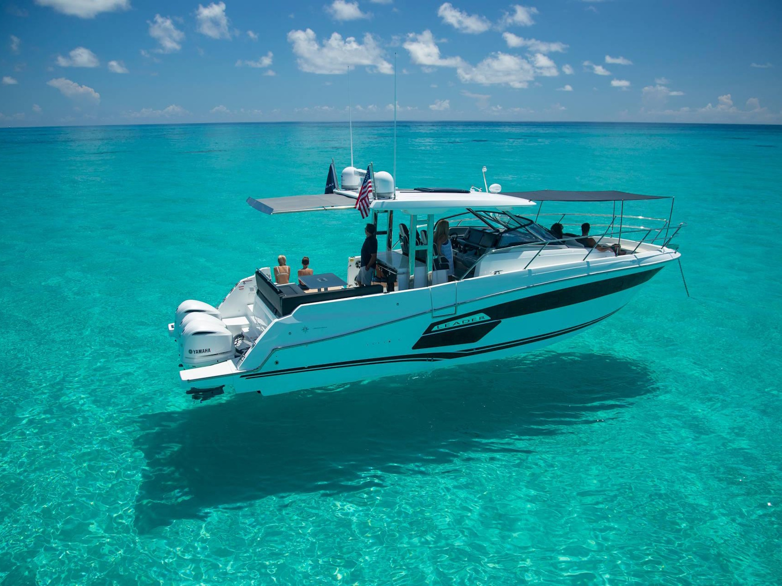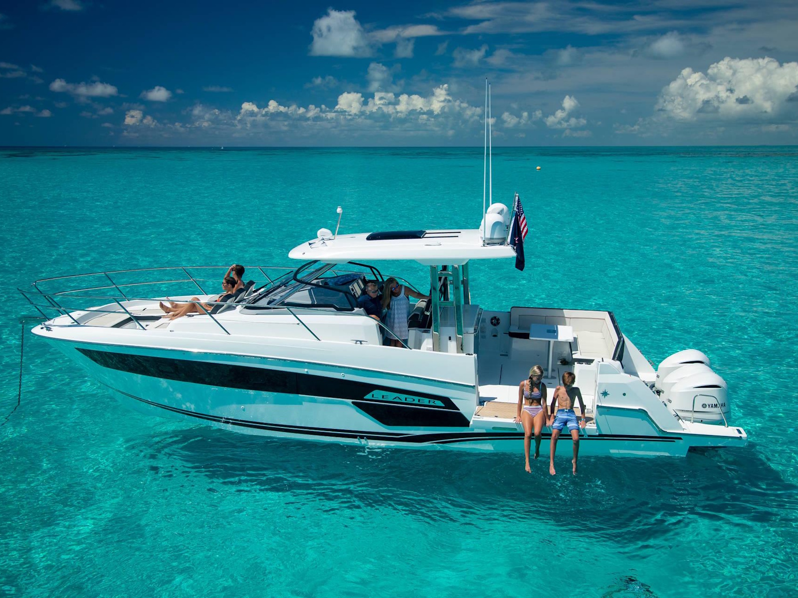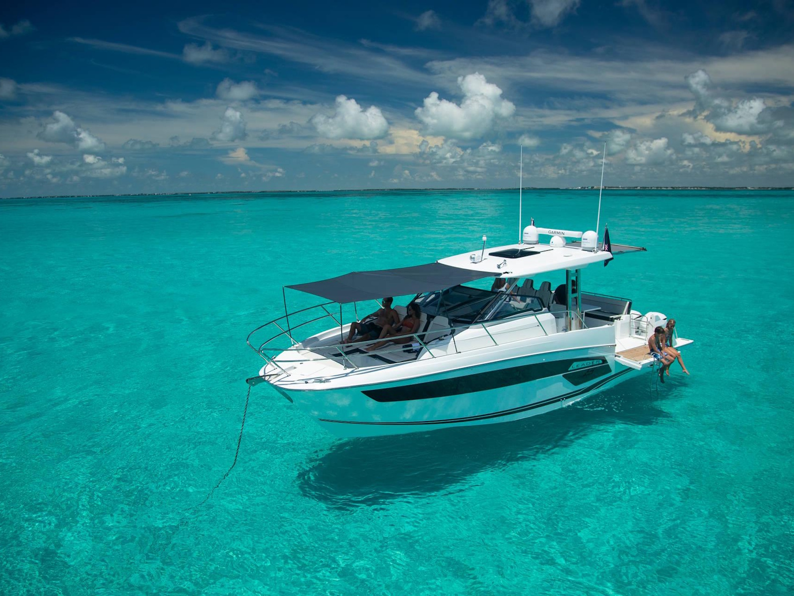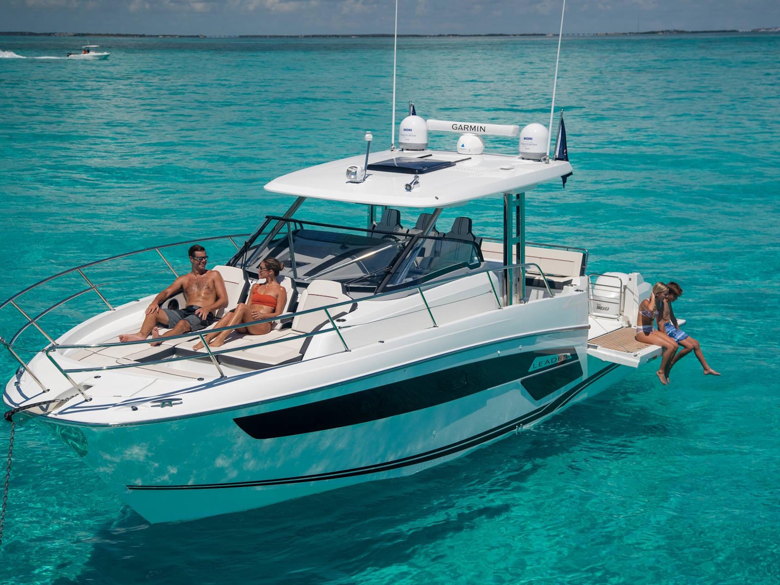 Spacious, comfortable, and extremely well equipped, on the interior as on the exterior, the Leader 12.5 also offers numerous options to suit your cruising lifestyle. The exterior galley fea-tures multiple configurations. The interior can be air conditioned. The cockpit can be sheltered from the sun by a sun awning or remote controlled SureShade awning. And, an optional gyro-scopic system stabilises the boat while cruising or stopped. With all of these qualities, the Leader 12.5 easily adapts to your lively outings with friends, as well as your family vacations.
