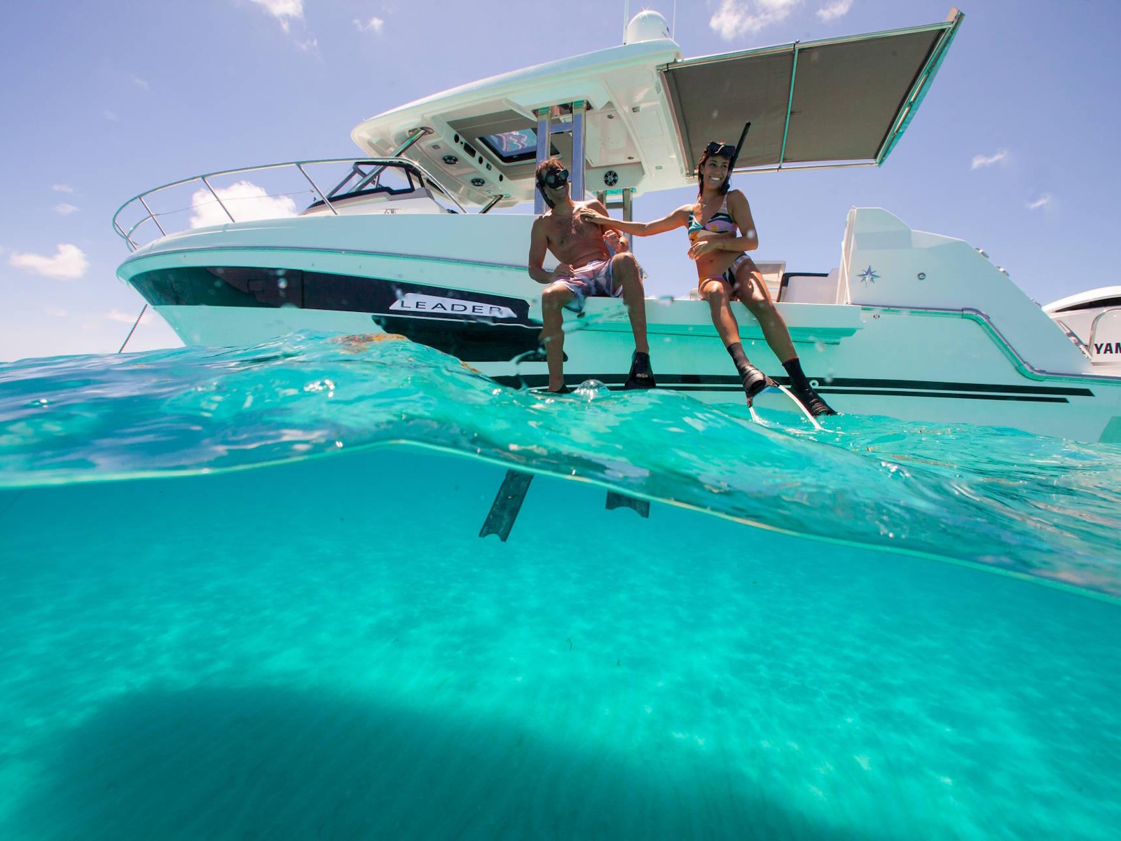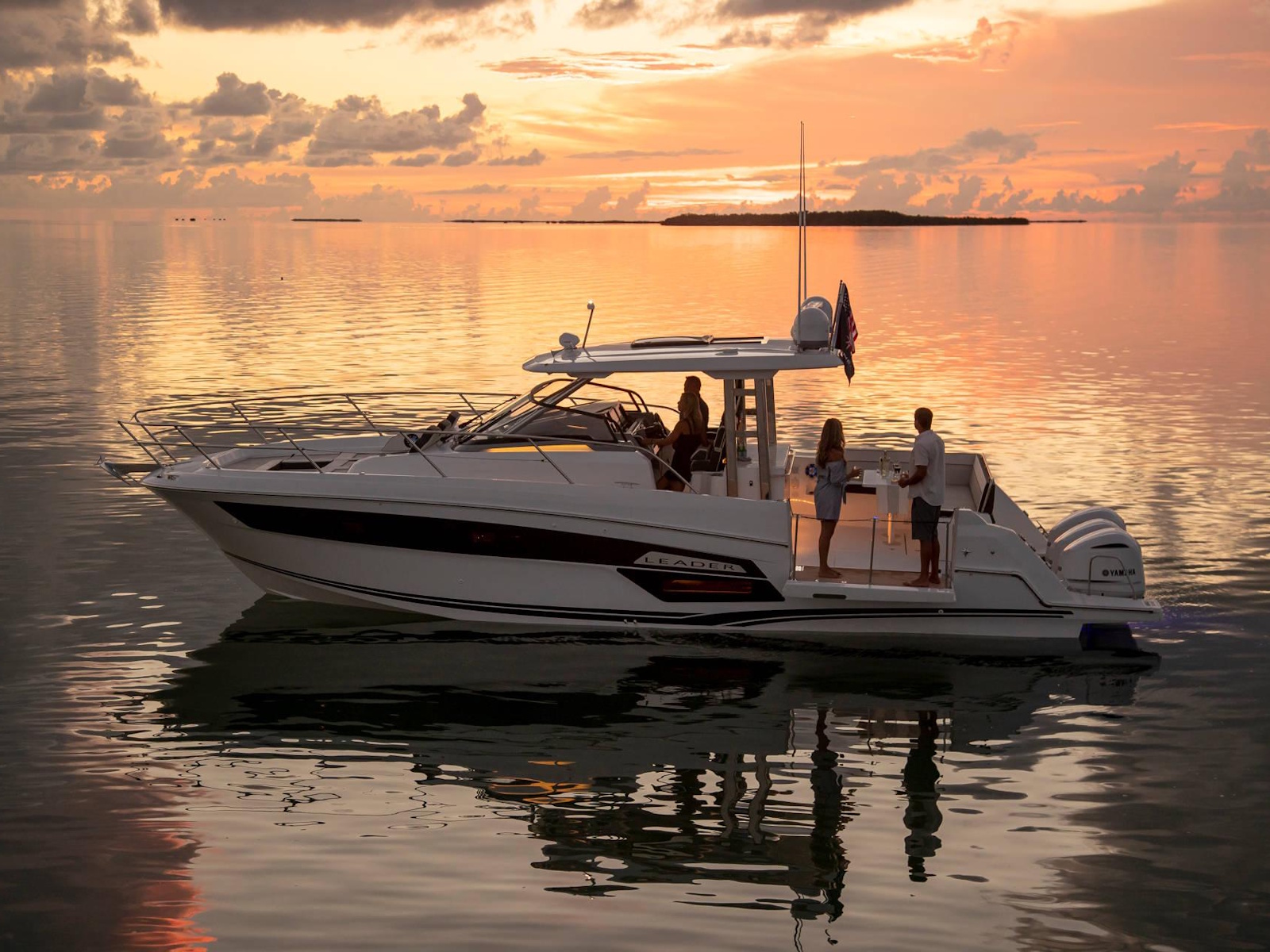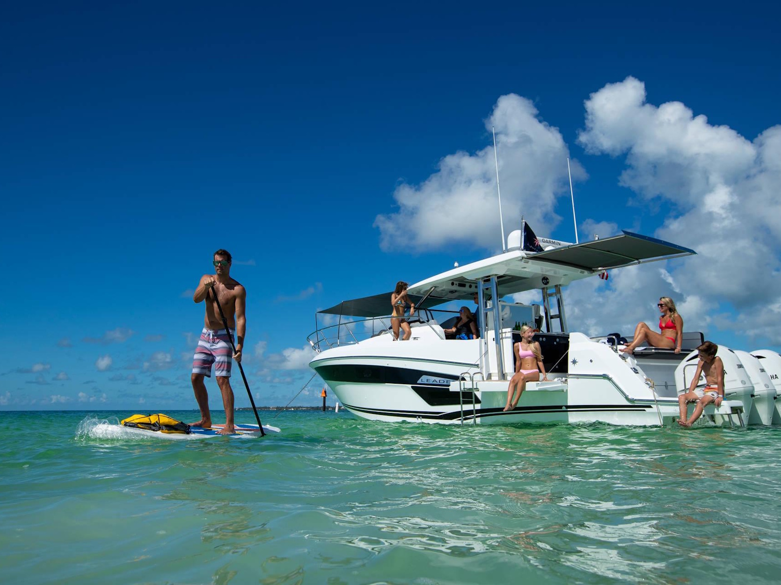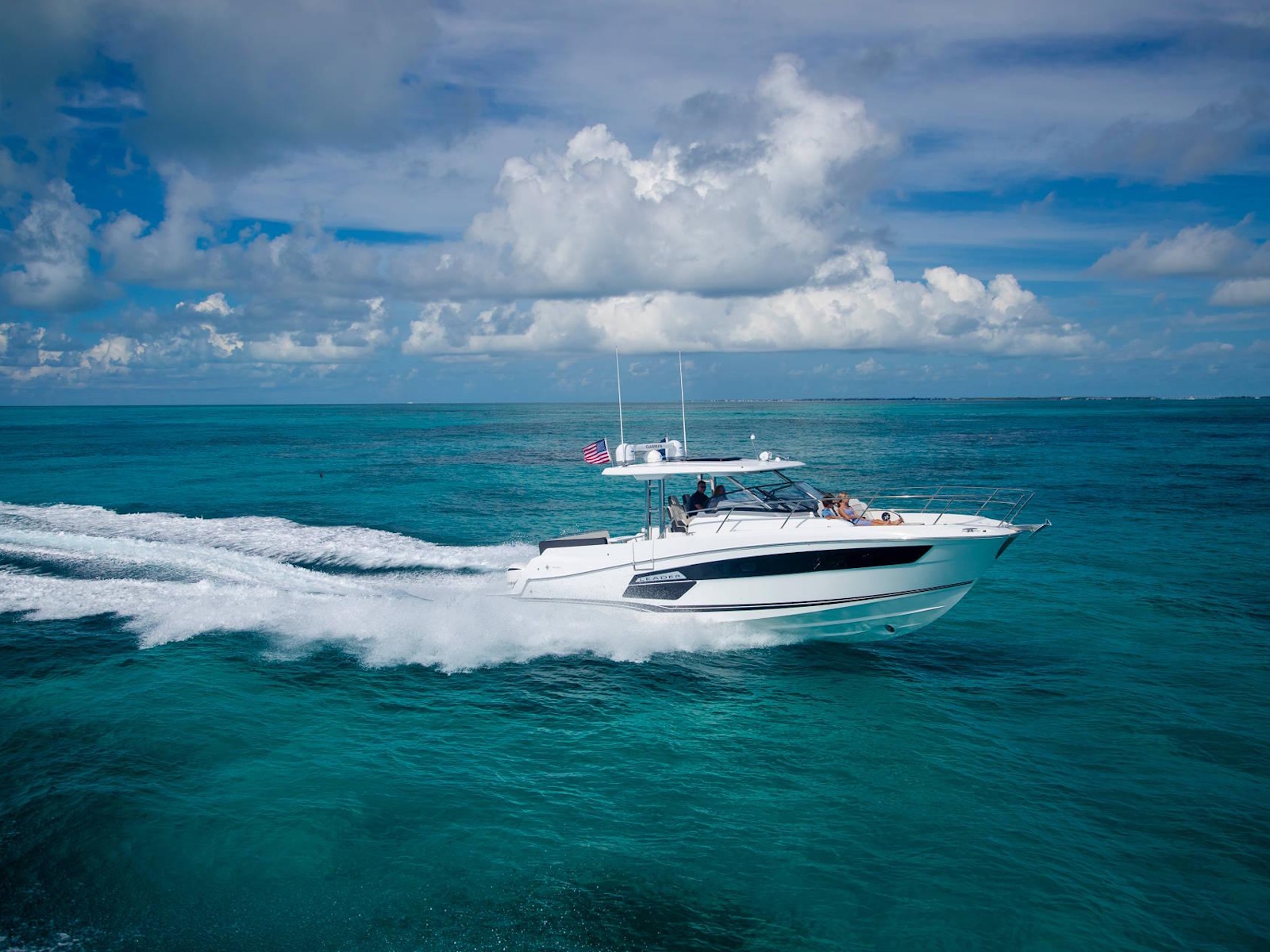 Spacious, comfortable, and extremely well equipped, on the interior as on the exterior, the Leader 12.5 also offers numerous options to suit your cruising lifestyle. The exterior galley fea-tures multiple configurations. The interior can be air conditioned. The cockpit can be sheltered from the sun by a sun awning or remote controlled SureShade awning. And, an optional gyro-scopic system stabilises the boat while cruising or stopped. With all of these qualities, the Leader 12.5 easily adapts to your lively outings with friends, as well as your family vacations.