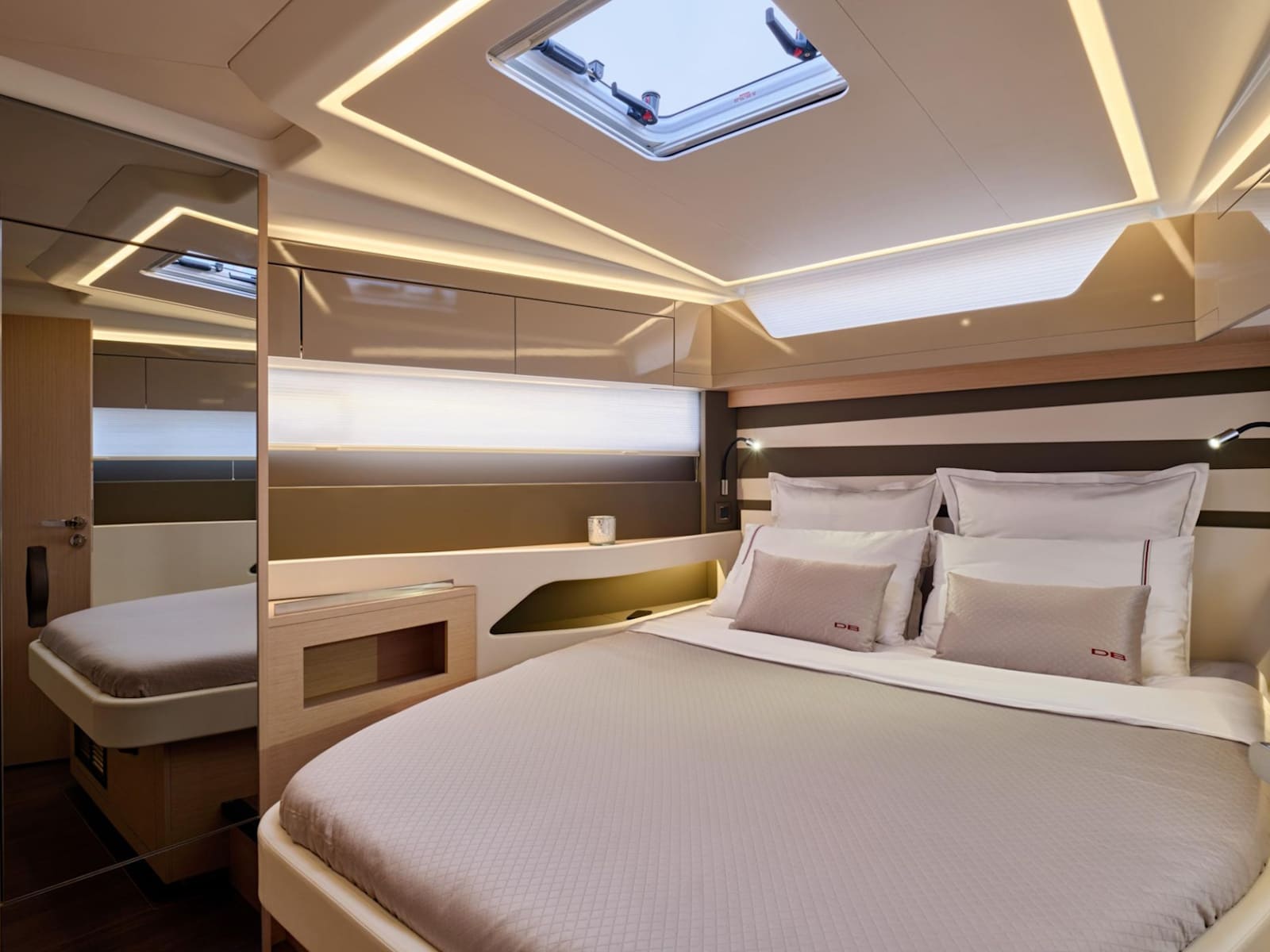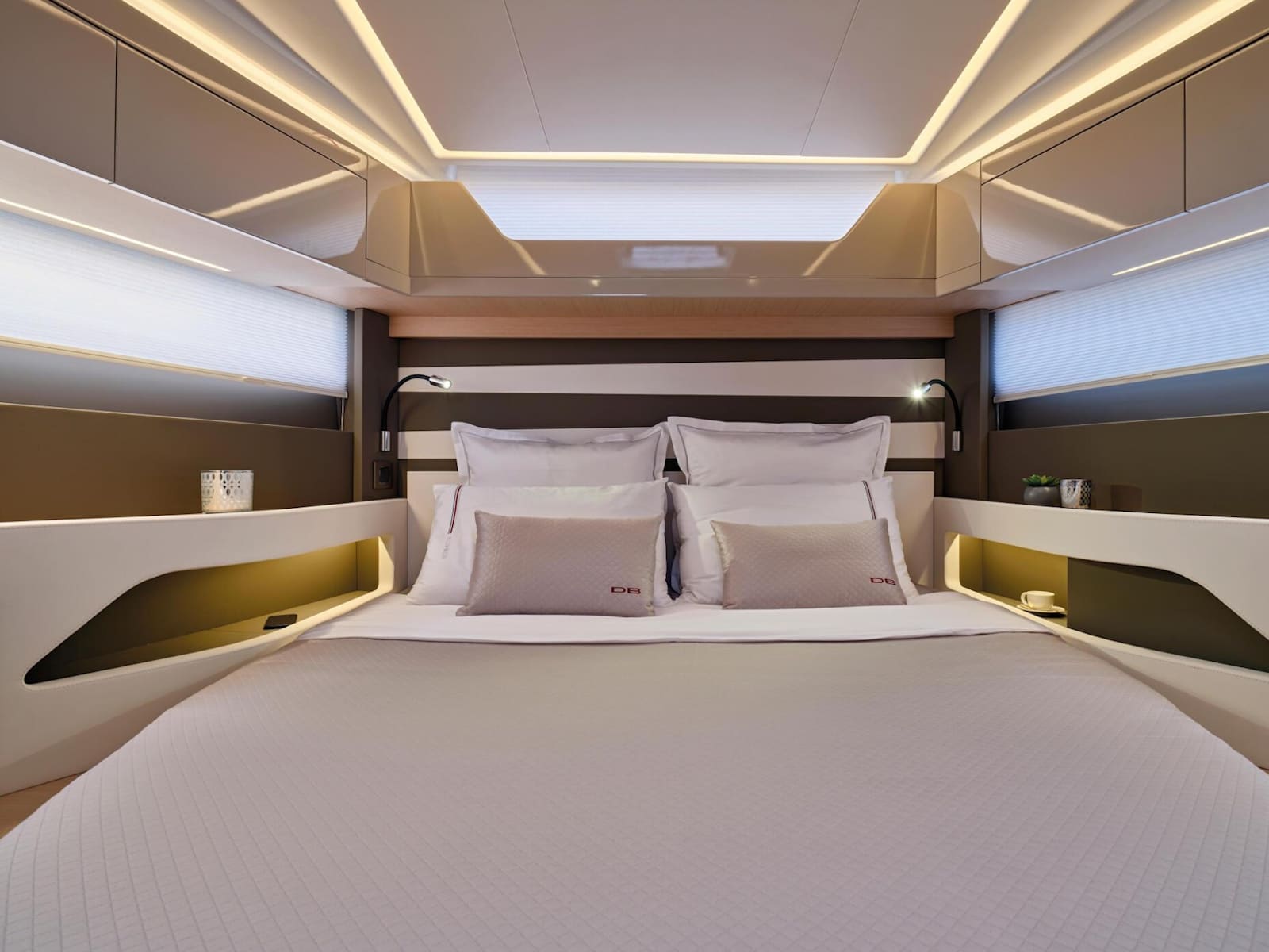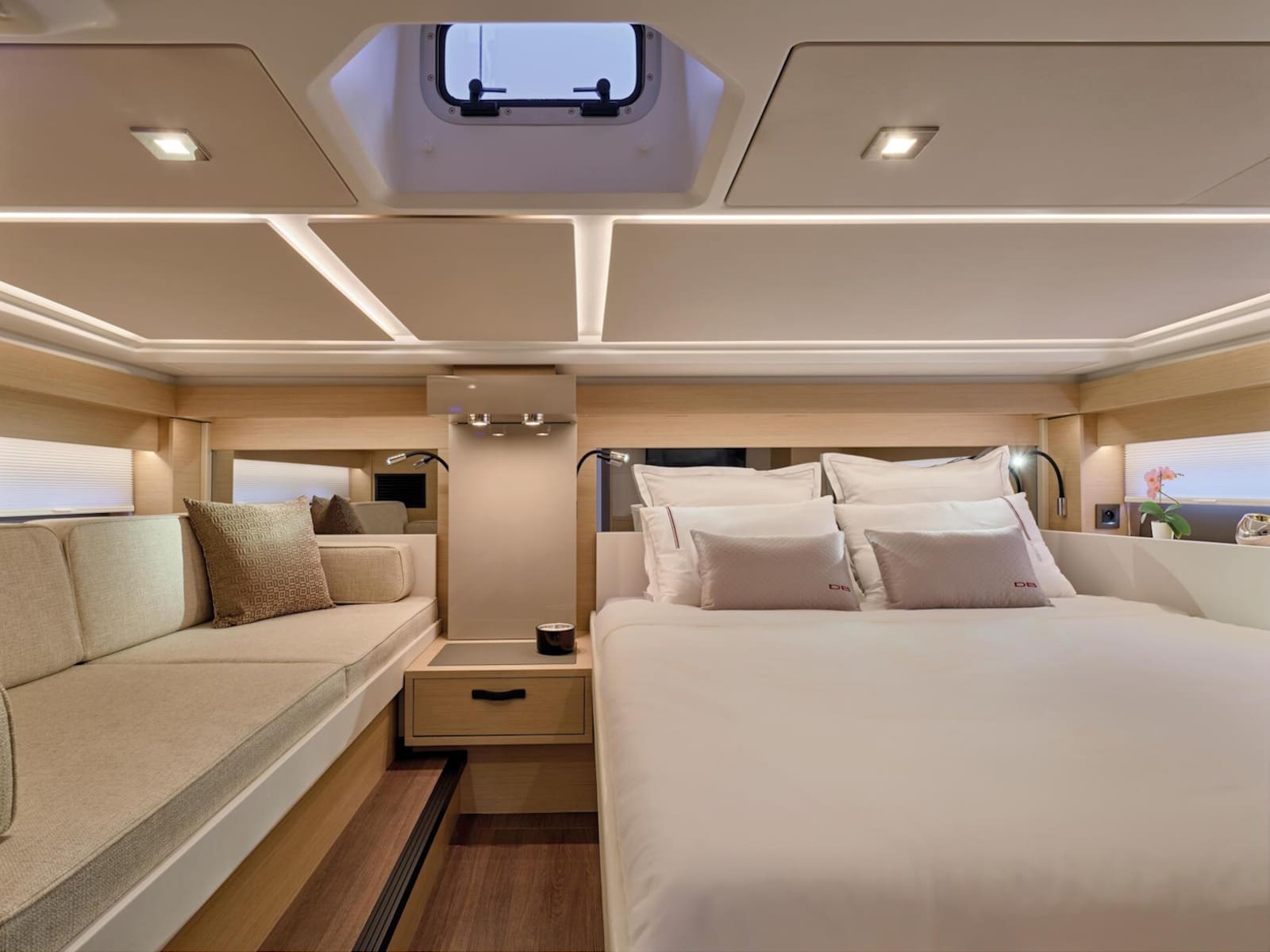 Dedicated to the pleasures of sea and sun, the DB/43 IB features an attractive, inviting interior. High-end furnishings afford exceptional comfort for spending a night on board with a couple of friends: the owner's cabin is spacious and bright, as well as the full-beam guest cabin, boasting a double berth and a third possible berth. With a Beach Club atmosphere on deck, under the sun or under the stars, surrounded by your guests, you can create unforgettable memories in dream locations.