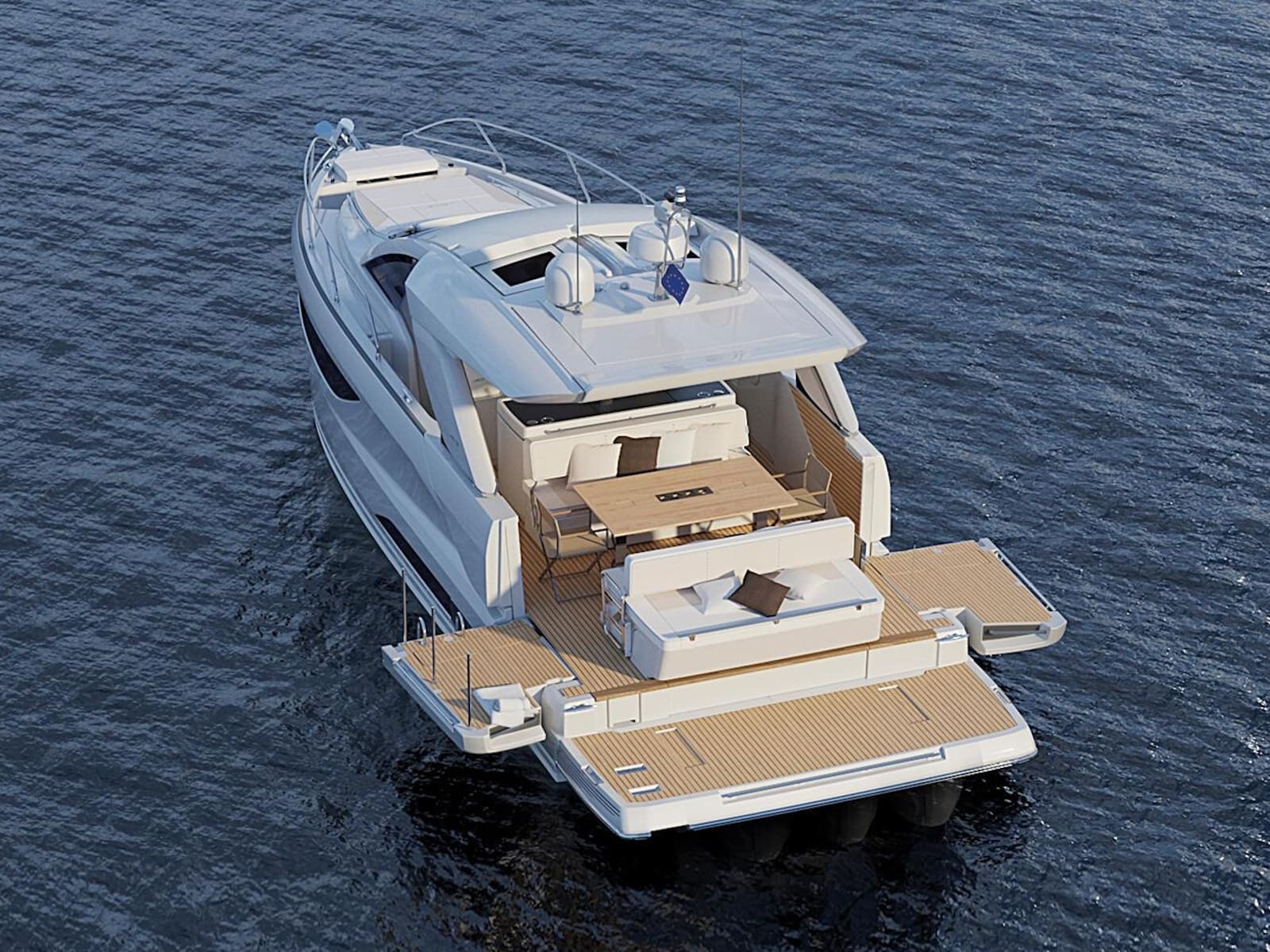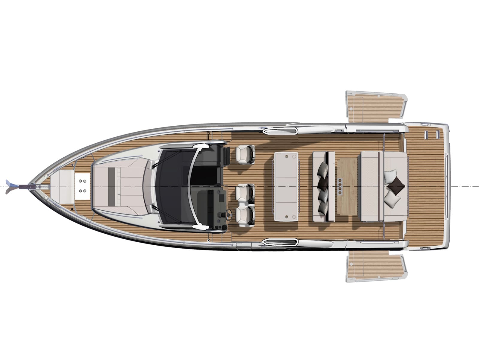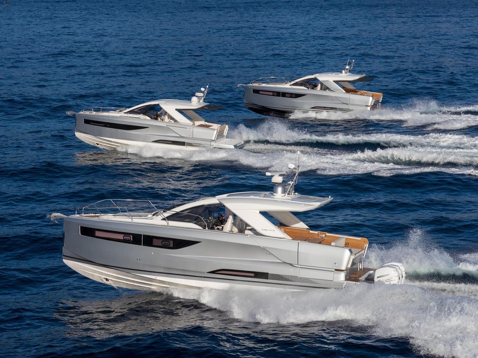 Safe and comfortable while cruising, the DB/43 IB can accommodate up to 12 people on board, securely seated. For a change in programme, at anchor, two side terraces can be deployed to form an immense aft swim platform, open to the sea. In just seconds, the seat backs pivot to reconfigure the cockpit into a magnificent saloon, backing an island galley with elegant bar styling. Cook while conversing, sip a cocktail, sunbathe on the forward deck, or swim among the fish… the choice is yours.
