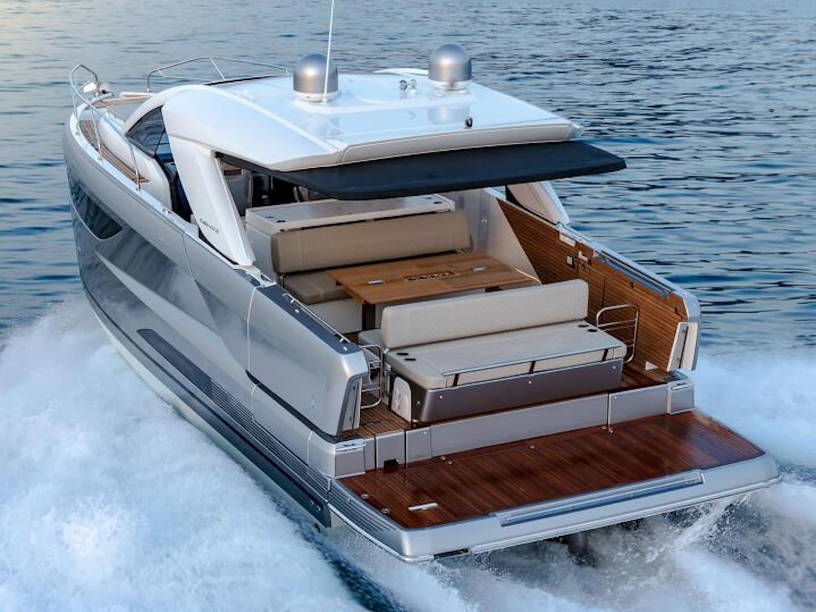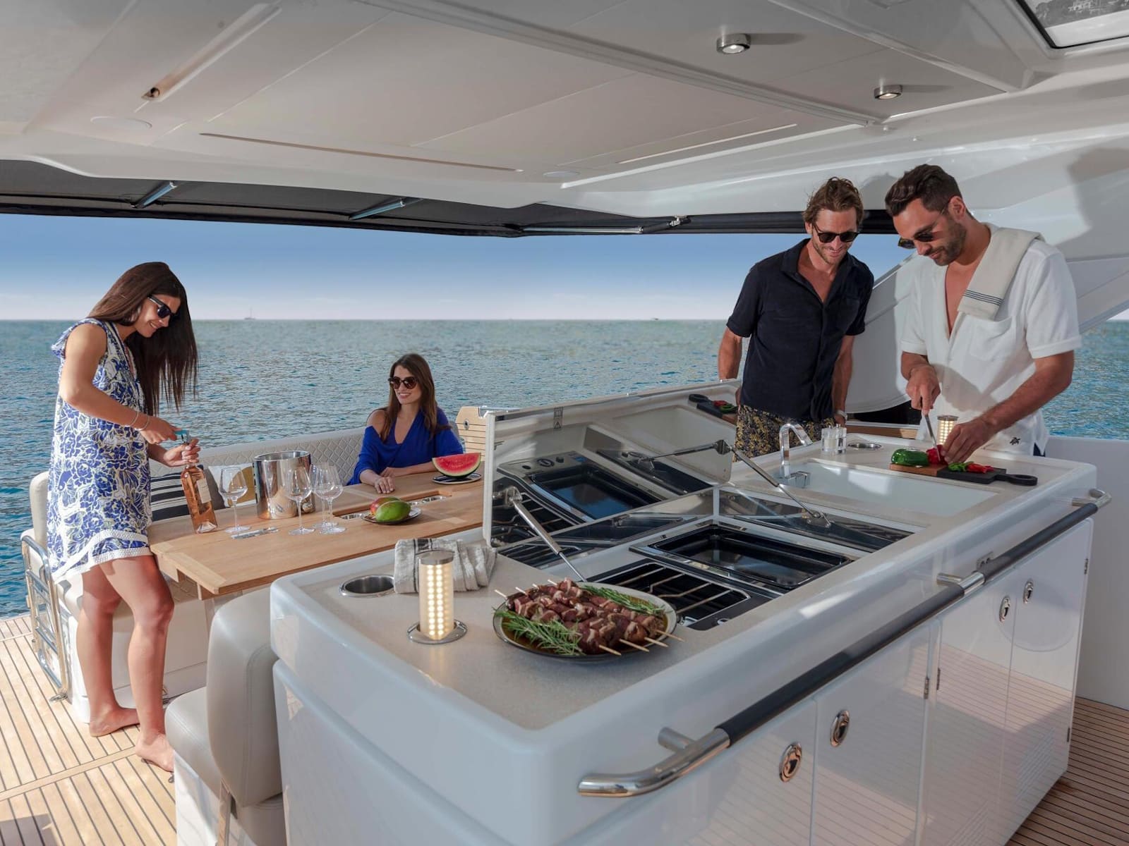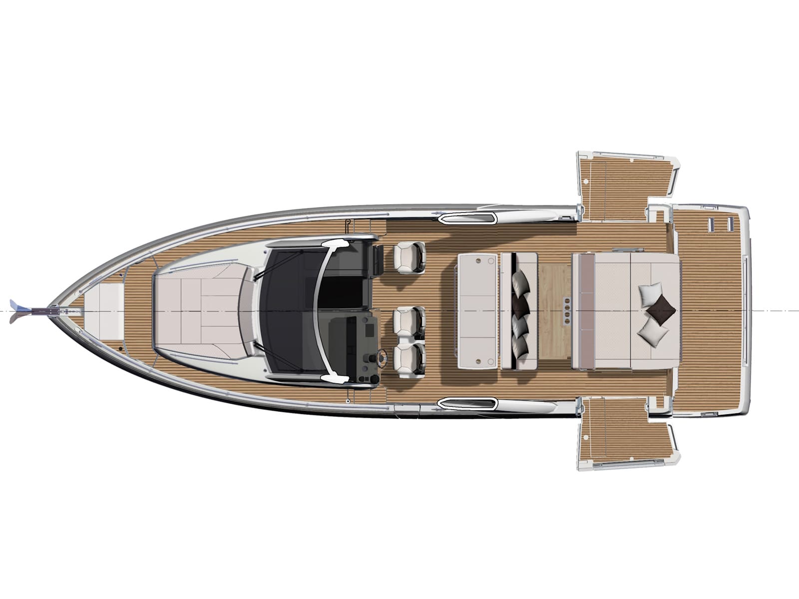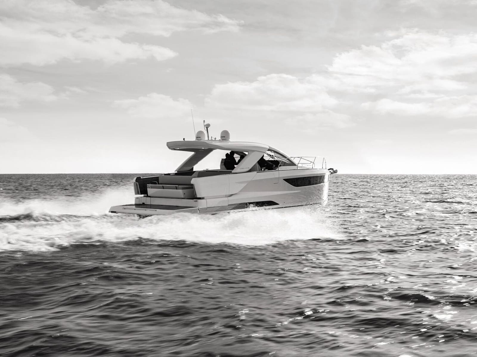 Safe and comfortable while cruising, the DB/43 IB can accommodate up to 12 people on board, securely seated. For a change in programme, at anchor, two side terraces can be deployed to form an immense aft swim platform, open to the sea. In just seconds, the seat backs pivot to reconfigure the cockpit into a magnificent saloon, backing an island galley with elegant bar styling. Cook while conversing, sip a cocktail, sunbathe on the forward deck, or swim among the fish… the choice is yours.